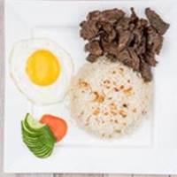 Marinated beed stripes with sunny side up egg and garlic rice